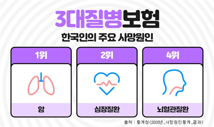 한국인의 주요 사망원인중에 암, 뇌혈관질환, 심혈관질환은 흔히 3대질병이라 일컬어지며 살아가면서 가장 먼저 대비해야 하는 중대질병으로 항상 강조되고 있다. 이들 질병에 미리 대비하기 위해 가입하는 것이 진단비보험인데, 이러한 3대질병진단비를 중점으로 보장하는 보장성보험이 3대진단비보험 이다. 3대질병진단비보험은 각각의 질병에 주목해서 보장하기도 하지만, 나에게 맞는 추가 특약을 잘 골라서 가입한다면 종합건강보험으로도 충분히 활용도가 높다.